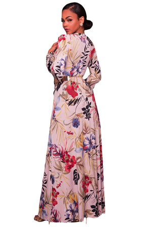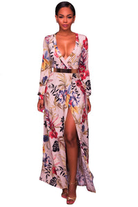 Ultra-chic yet ultra-sexy, this fun maxi dress is sure to turn heads at every party. Floral print in shades of vibrant flowers and leaves ripple across a pure backdrop as it shapes a surplice bodice framed by faux wrap silhouette with long sleeves. A billowing maxi skirt with front slit falls below the waist for a stunning finish.